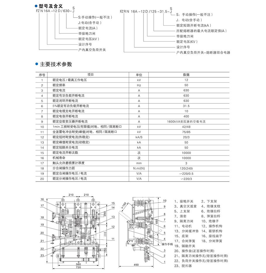 FZN16A- 12D/630型戶內(nèi)交流高壓真空負(fù)荷開關(guān)及FZN16A- 12RD/200- 31.5型負(fù)荷開關(guān)-熔斷器組合電器性能達(dá)到GB3804-90<3~63kV交流高壓負(fù)荷開關(guān)>和IEC420<交流高壓負(fù)荷開關(guān)-熔斷器組合電器>(1990年版)國際標(biāo)準(zhǔn)及國家標(biāo)準(zhǔn)(報(bào)批稿)的要求。具有體積小、外形美觀、安裝靈活、操作力小、開斷安全可靠、電壽命長、可頻繁每操作、開斷轉(zhuǎn)移電流大、基本不需要維護(hù),有明顯的隔離斷口且具有手、電動(dòng)二用功能,可實(shí)現(xiàn)遠(yuǎn)距離控制等優(yōu)點(diǎn)。負(fù)荷開關(guān)-熔斷器組合電器還具有保護(hù)變壓器過載,防止設(shè)備缺相運(yùn)行的功能。