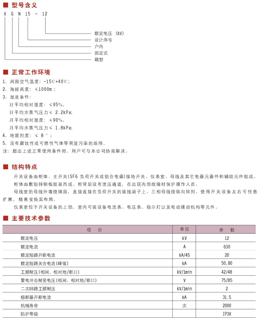 XGN15-12箱型固定式戶內(nèi)交流金屬封閉開(kāi)關(guān)設(shè)備(簡(jiǎn)稱“開(kāi)關(guān)設(shè)備”),用于額定電壓為12KV、額定電流630A及以下和環(huán)網(wǎng)供電或輻射型供電系統(tǒng)中,尤其適合裝入預(yù)裝式變電站作為電力系統(tǒng)的控制和保護(hù)。